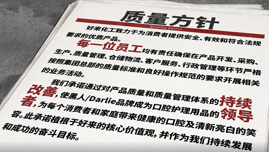 好來化工通過對產(chǎn)品質(zhì)量和質(zhì)量管理體系的持續(xù)改善,使“DARLIE”黑人品牌成為口腔護(hù)理用品的領(lǐng)導(dǎo)者,為每個消費(fèi)者和家庭帶來健康的口腔及清新亮白的笑容。此承諾植根于好來的核心價值觀,并作為好來持續(xù)發(fā)展和成功的奮斗目標(biāo)。