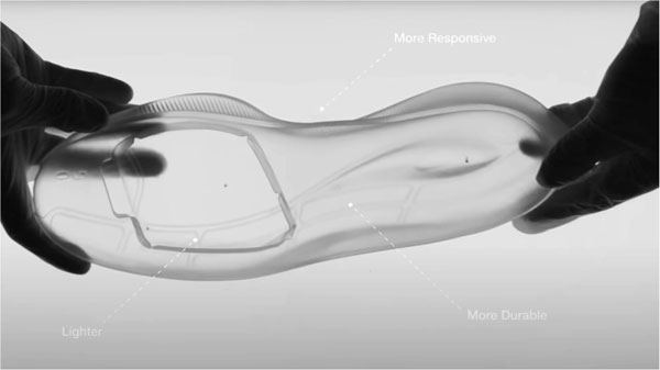 “氮氣超臨界物理發(fā)泡、一體成型,讓運動選手上場就能爆出好料”——這是安踏氮科技帶來的直觀表現(xiàn)!現(xiàn)場,安踏品牌鞋創(chuàng)新管理中心高級總監(jiān)蔡之本解讀了“動創(chuàng)未來”這一主題,同時他還列舉了一組數(shù)據(jù)——氮科技加持下的材料實現(xiàn)能量回歸率高達86.8%,材料密度僅為0.09g/cm³,耐久性方面提升30%,綜合性能表現(xiàn)遠高于同行。