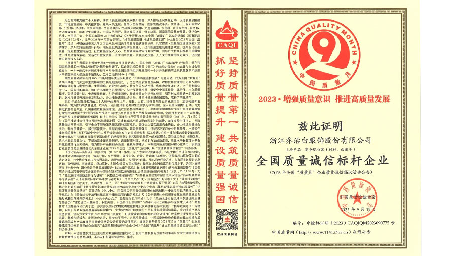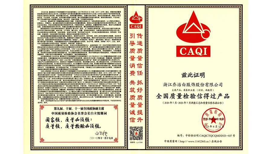 浙江喬治白服飾股份有限公司自創(chuàng)業(yè)以來(lái),堅(jiān)持品牌戰(zhàn)略,通過(guò)了ISO9000質(zhì)量管理體系、ISO14001環(huán)境管理體系和OHSAS18000職業(yè)健康安全管理體系認(rèn)證。采用意大利GIUSEPPE公司的設(shè)計(jì)理念,不斷推出糅合經(jīng)典與時(shí)尚的完美產(chǎn)品。