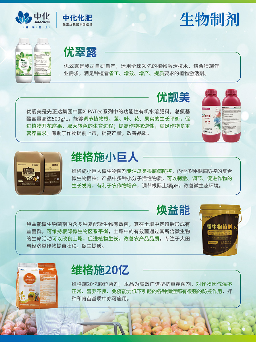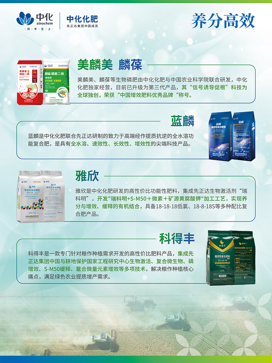 美麟美、麟葆等生物磷肥由中化化肥與中國農(nóng)業(yè)科學院聯(lián)合研發(fā),中化化肥獨家經(jīng)營,目前已升級為第三代產(chǎn)品,其“信號誘導促根”科技為全球獨創(chuàng),榮獲“中國增效肥料優(yōu)秀品牌“稱號藍麟是中化化肥聯(lián)合先正達研制的致力于高端經(jīng)作提質(zhì)抗逆的全水溶功能復合肥,是具有全水溶、速效性、長效性、增效性的尖端科技產(chǎn)品。