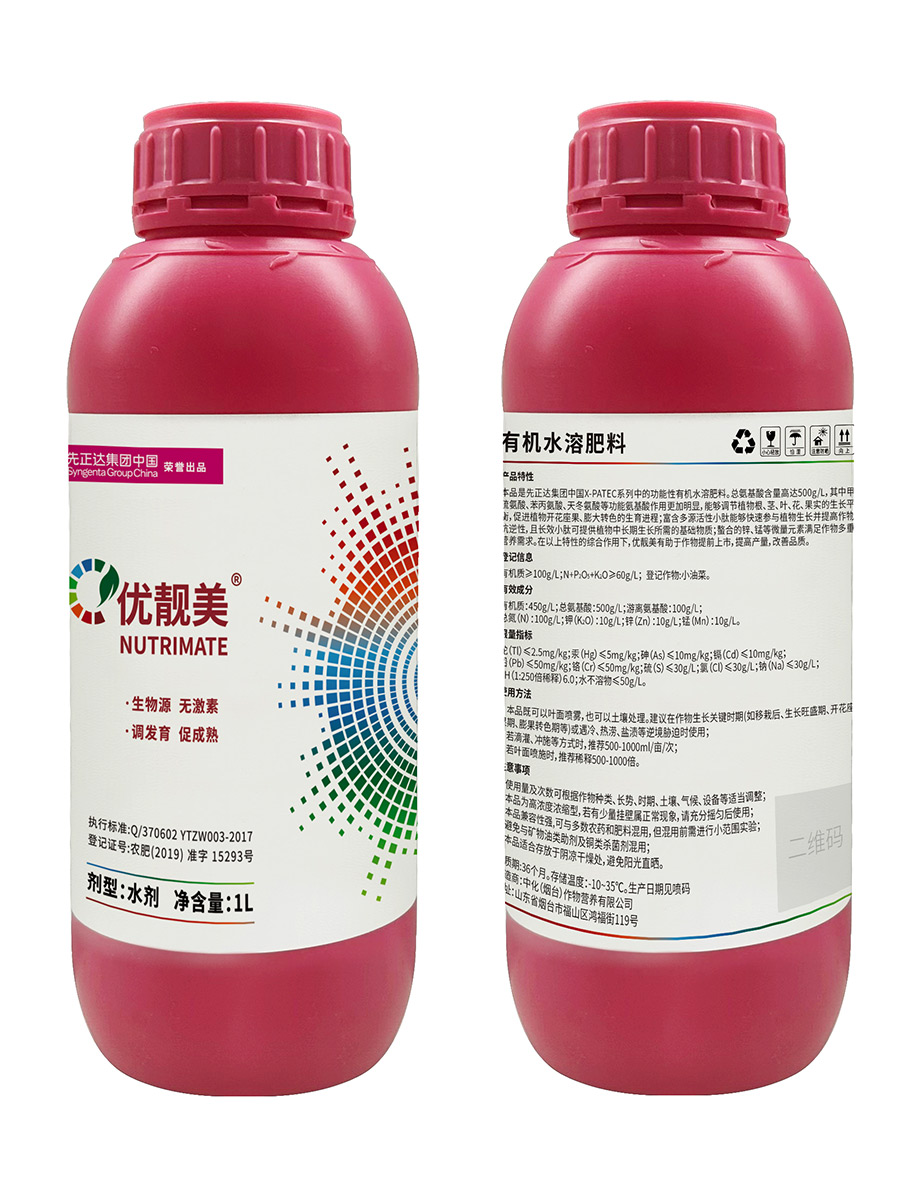 優(yōu)靚美是先正達集團中國X-PATec系列中的功能性有機水溶肥料。總氨基酸含量高達500g/L,能夠調(diào)節(jié)植物根、莖、葉、花、果實的生長平衡,促進植物開花座果、膨大轉(zhuǎn)色的生育進程;提高作物抗逆性,滿足作物多重營養(yǎng)需求。有助于作物提前上市,提高產(chǎn)量,改善品質(zhì)。