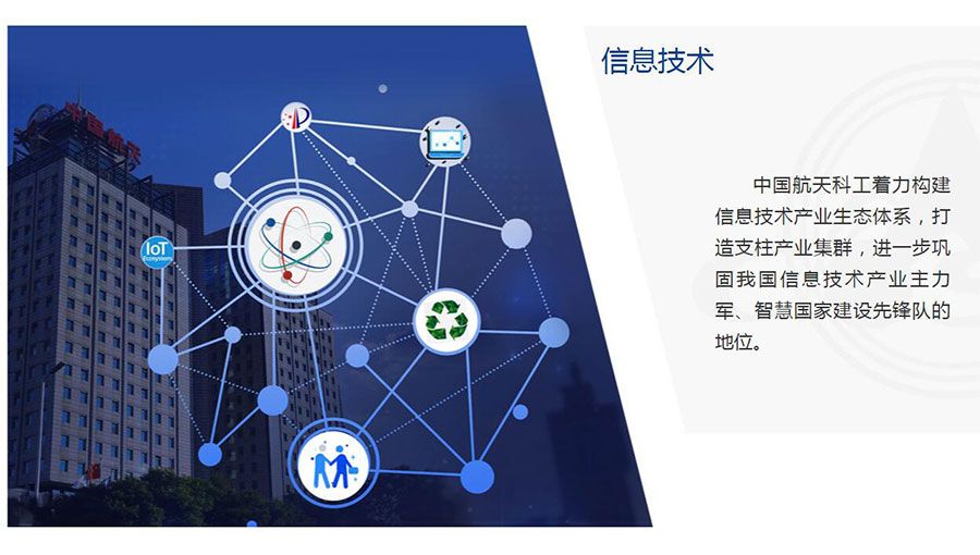 信息技術(shù)應(yīng)用創(chuàng)新產(chǎn)業(yè)助力網(wǎng)絡(luò)強(qiáng)國(guó)建設(shè),以航天系統(tǒng)工程優(yōu)勢(shì)服務(wù)于國(guó)家信息安全和經(jīng)濟(jì)安全;工業(yè)互聯(lián)網(wǎng)平臺(tái)——航天云網(wǎng)大力推進(jìn)新一代信息技術(shù)與傳統(tǒng)產(chǎn)業(yè)全方位深度融合,為全球制造業(yè)企業(yè)提供智能制造、協(xié)同制造、云制造服務(wù);智慧產(chǎn)業(yè)面向政府、行業(yè)和企業(yè)應(yīng)用需求,構(gòu)建智慧系統(tǒng)平臺(tái),打造各類專業(yè)應(yīng)用,助力國(guó)民經(jīng)濟(jì)結(jié)構(gòu)戰(zhàn)略性調(diào)整。