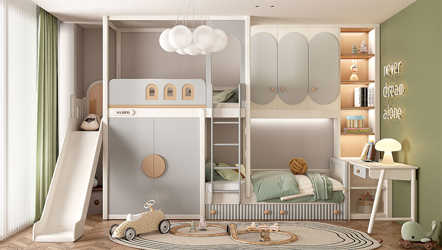 松堡王國圍繞孩子成長居家生活四大基礎(chǔ)功能:學(xué)習(xí)區(qū)、收納區(qū)、娛樂區(qū)、睡眠區(qū),深度交合孩子成長方式,以美學(xué)設(shè)計、親子陪伴、趣味模塊為新空間設(shè)計概念,正向引導(dǎo)孩子建立良好生活習(xí)慣,形成成長生活秩序感,用愛為孩子打造有趣的成長空間。