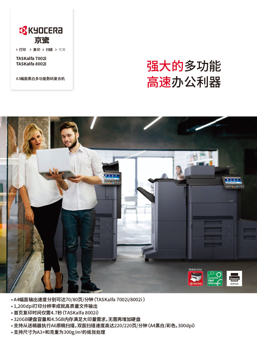 主要產(chǎn)品:KYOCERA京瓷激光打印機(jī),一體機(jī),復(fù)合機(jī),生產(chǎn)型彩色噴墨數(shù)碼印刷系統(tǒng)及辦公信息系統(tǒng)的開(kāi)發(fā)、設(shè)計(jì)、系統(tǒng)集成