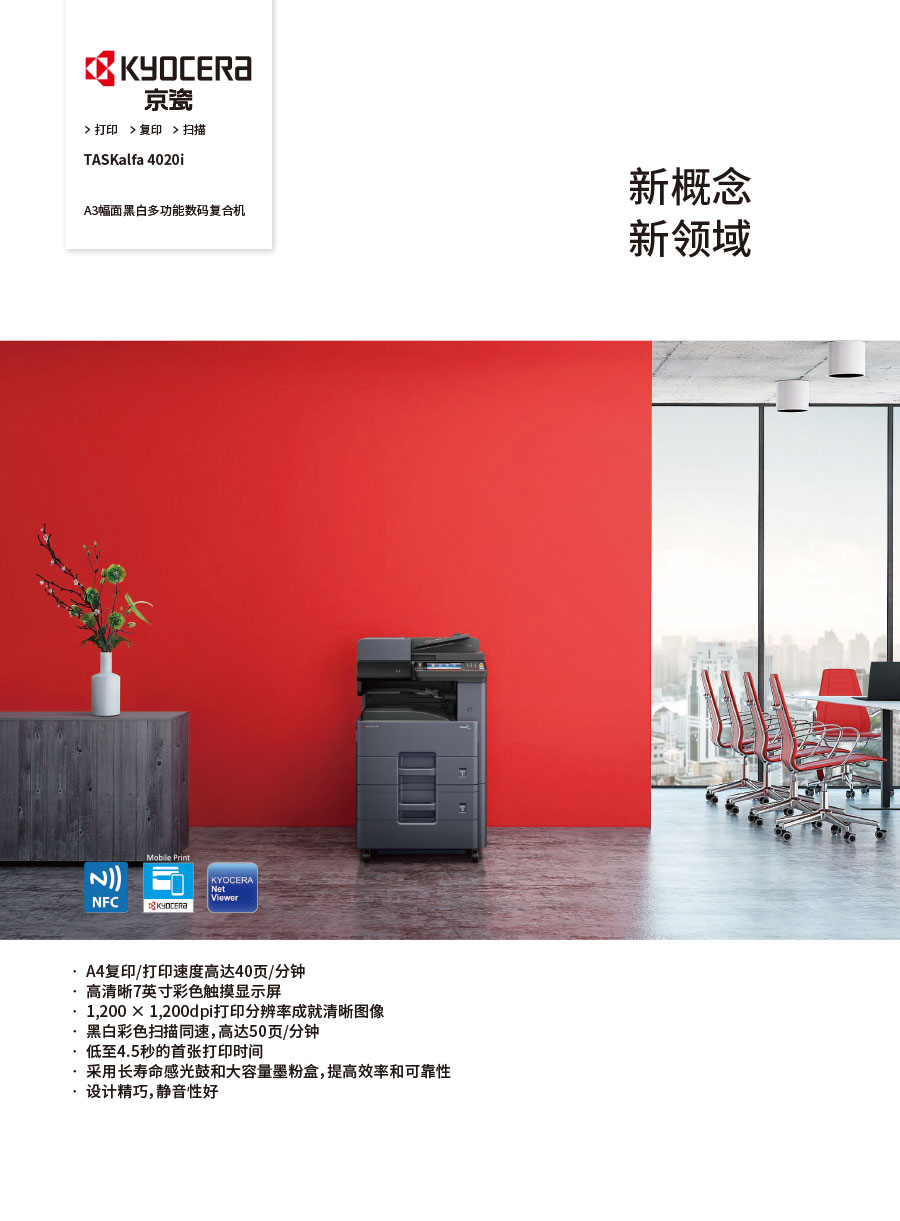 京瓷辦公信息系統(tǒng)(中國)有限公司主要負(fù)責(zé)彩色和黑白數(shù)碼復(fù)合機(jī)、彩色和黑白數(shù)碼激光打印機(jī)、辦公解決方案等系列辦公自動化設(shè)備的銷售。我們將一如既往延續(xù)ECOSYS理念,始終站在時代前沿,以科技服務(wù)社會,堅持開發(fā)更能滿足時代需求、更為綠色的新銳產(chǎn)品,使用戶都能夠從中獲得更大的利益。