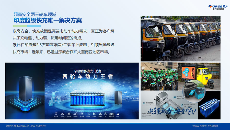 以完善的研發(fā)體系,格力鈦加快技術創(chuàng)新與產業(yè)升級的步伐。格力鈦研發(fā)的格力鈦電池安全性長期領跑行業(yè),憑借具有高安全、大倍率、快充放、耐寬溫、長壽命等特性,被選為“國家制造業(yè)單項冠軍產品”,廣泛應用于新能源汽車以及工商業(yè)園區(qū)、通訊基站、電網調頻、軌道交通、風光消納、船舶岸電、家庭住宅、軍事科研等儲能領域,具有廣闊的市場前景和應用價值。目前,格力鈦儲能產品已在丹麥、瑞士、芬蘭等全球30多個國家和地區(qū)使用,新能源汽車產品在北京、杭州、武漢、成都、青島、哈爾濱、包頭、??诘热?40多座城市運營,12年全球零電池事故安全運行。