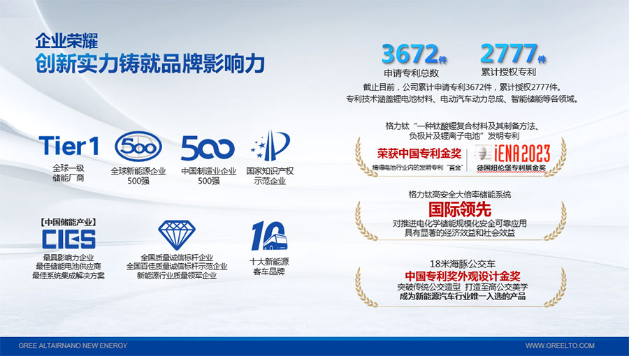 2022年,“一種鈦酸鋰復合材料及其制備方法、負極片及鋰離子電池”發(fā)明專利獲得中國專利金獎,摘得鋰電池行業(yè)內的發(fā)明專利“首金”;2023年,該專利技術再次斬獲第75屆德國紐倫堡發(fā)明國際金獎。“高安全大倍率儲能系統(tǒng)關鍵技術研發(fā)與應用”項目被中國機械工業(yè)聯合會鑒定達到“國際領先”水平。截至目前,格力鈦先后獲得“中國民營企業(yè)制造業(yè)500強”、“全國質量信得過產品”、“客車安全技術成果獎”、“中國儲能產業(yè)最具影響力企業(yè)獎、最佳系統(tǒng)集成商、最佳儲能電池供應商”等榮譽,獲得工信部頒發(fā)的“綠色工廠”榮譽稱號;上榜科技部發(fā)布的新能源領域獨角獸企業(yè),多年入選全球新能源企業(yè)500強,入選“全國百佳質量檢驗誠信標桿企業(yè)”、“國家知識產權優(yōu)勢企業(yè)”等。