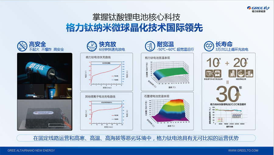 鈦酸鋰電池技術是新能源行業(yè)唯一獲得中國專利獎金獎的鋰電池產品技術,其應用于儲能電池和動力電池具有超高安全性,在快充放、耐寬溫、長壽命等方面同樣具有卓越的性能。格力鈦電池系列產品具有不起火不爆炸高安全、6分鐘快充放、-50℃至60℃耐寬溫特性,循環(huán)充放電次數高達30000多次,使用壽命長達30年。格力鈦電池經利鋸切割、尖針穿刺、強力擠壓、電鉆沖孔、短路充放電、高溫加熱、槍擊等極限條件測試,均未發(fā)生冒煙、起火、燃燒、爆炸等現象。