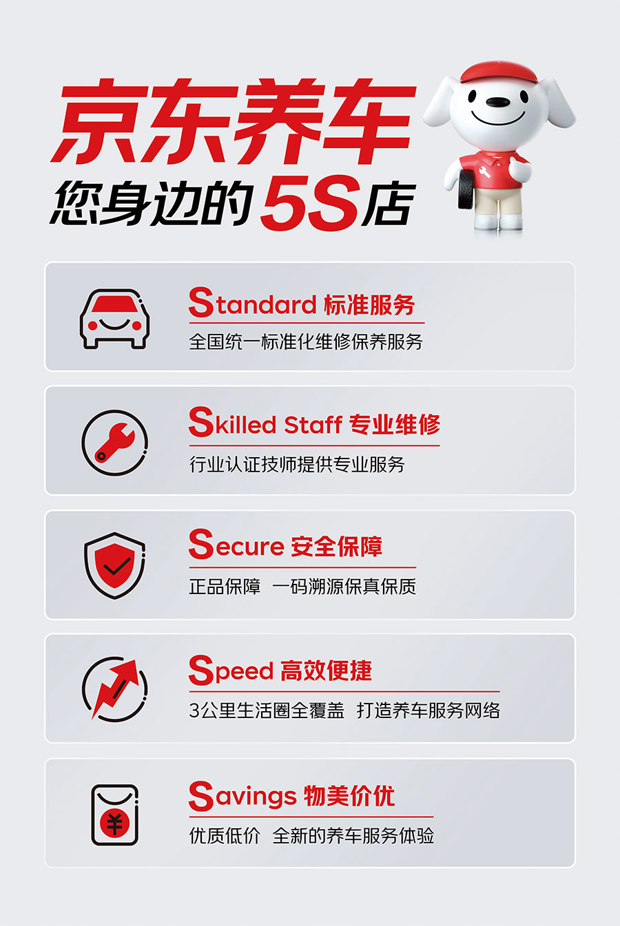 在養(yǎng)車標準方面京東養(yǎng)車秉承有保障、更專業(yè)的品牌服務(wù)理念,推出全新5S服務(wù)標準。從多個維度保障客戶權(quán)益,提升服務(wù)品質(zhì)。