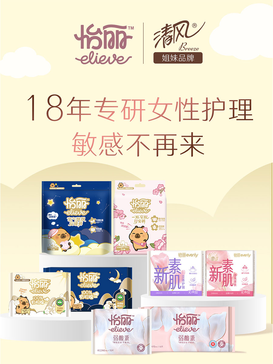 “鉑麗雅”品牌“借助自然的力量”為女性帶來(lái)美好的個(gè)人美妝護(hù)理體驗(yàn)。“真真”專(zhuān)業(yè)舒適型成人護(hù)理品牌,主打?qū)I(yè)、舒適、極致性?xún)r(jià)比。“怡麗”以膚感定義舒適,專(zhuān)注衛(wèi)生巾膚感科技,探索無(wú)感舒適體驗(yàn)。