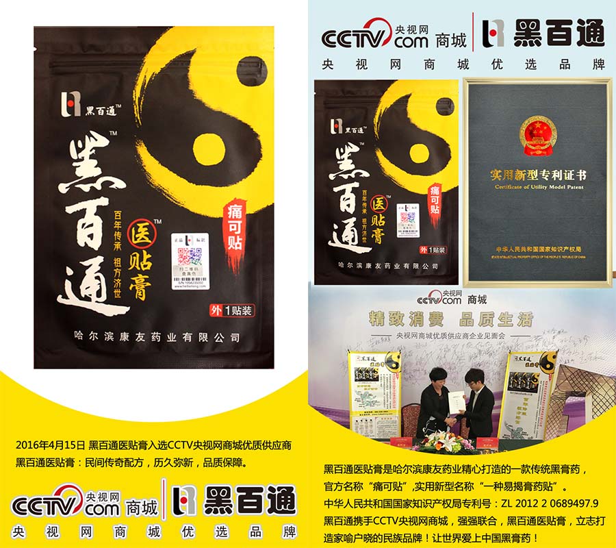 黑百通醫(yī)貼膏,每貼使用6-7天,持續(xù)使用168+小時。黑百通攜手CCTV央視網商城,強強聯(lián)合,立志打造家喻戶曉的民族品牌,讓世界愛上中國的黑膏藥!