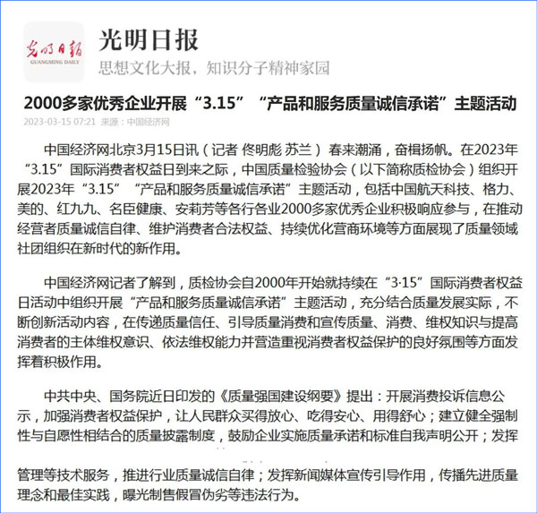 中國(guó)經(jīng)濟(jì)網(wǎng):2000多家優(yōu)秀企業(yè)開(kāi)展“3·15”“產(chǎn)品和服務(wù)質(zhì)量誠(chéng)信承諾”主題活動(dòng)