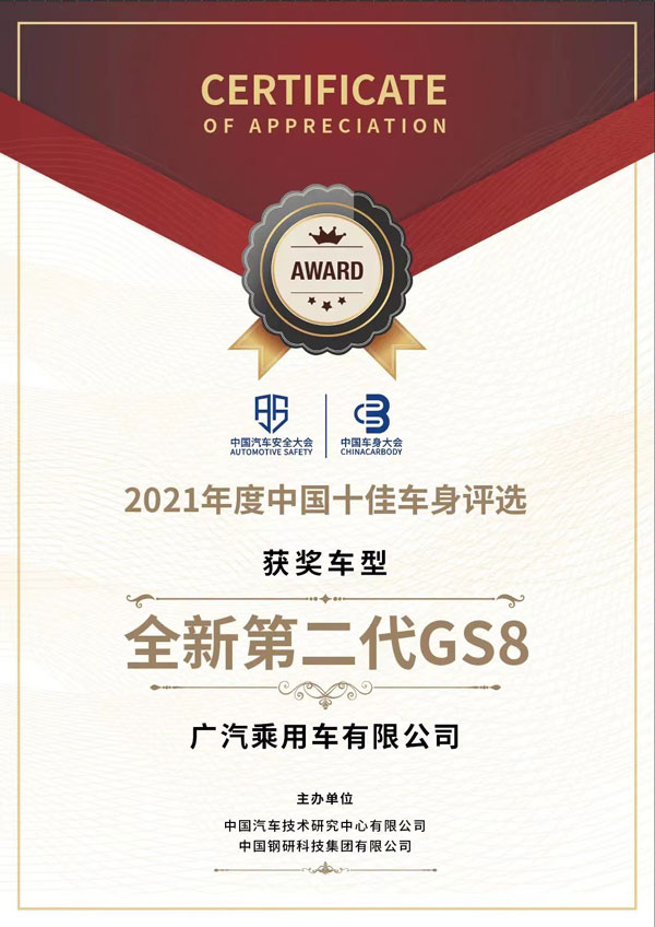 全新第二代GS8獲2021年度中國十佳車身