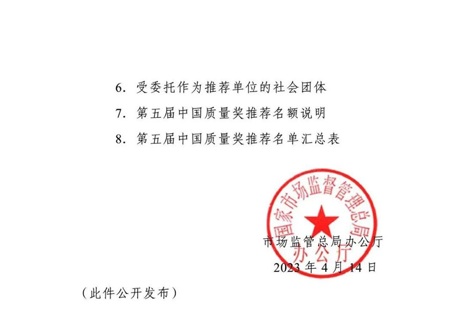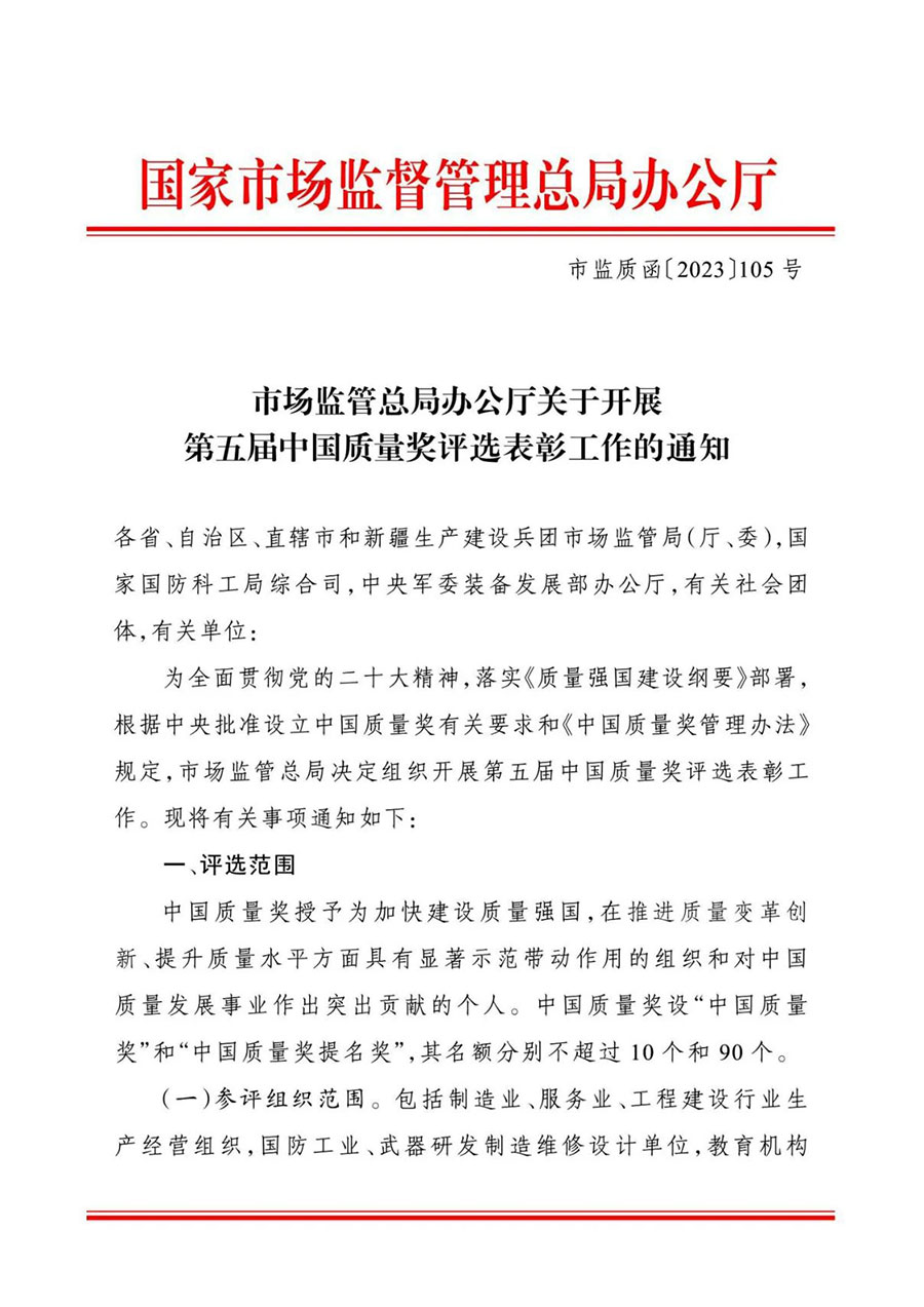 為全面貫徹黨的二十大精神,落實《質(zhì)量強國建設(shè)綱要》部署,根據(jù)中央批準設(shè)立中國質(zhì)量獎有關(guān)要求和《中國質(zhì)量獎管理辦法》規(guī)定,市場監(jiān)管總局決定組織開展第五屆中國質(zhì)量獎評選表彰工作?,F(xiàn)將有關(guān)事項通知如下: