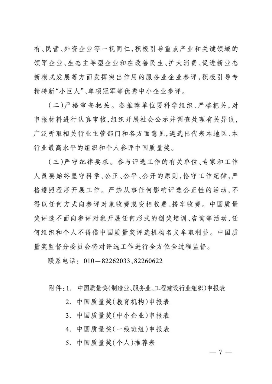 審核推薦材料(包括紙質(zhì)版及電子版光盤或U盤)寄至中國質(zhì)量獎評選表彰委員會秘書處(地址:北京市東城區(qū)安定門外大街56號,市場監(jiān)管總局質(zhì)量發(fā)展局質(zhì)量管理處;郵編:100011),電子版材料同時發(fā)送至zgzlj@samr.gov.cn,郵件標題為“推薦單位名稱+聯(lián)系人+手機號碼”。審核推薦材料包括:推薦函、推薦名單匯總表(見附件8)、申報材料。材料接收時間截止至6月19日。