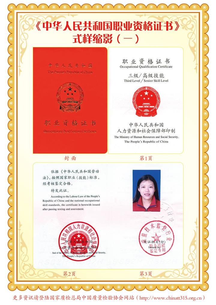參加我會(huì)組織的培訓(xùn)并經(jīng)考試、鑒定合格者,將由(國家質(zhì)量監(jiān)督檢驗(yàn)檢疫總局)質(zhì)量技術(shù)監(jiān)督行業(yè)職業(yè)技能鑒定指導(dǎo)中心頒發(fā)中華人民共和國勞動(dòng)和社會(huì)保障部印制的《中華人民共和國職業(yè)資格證書》(初級(jí)、中級(jí)、高級(jí))。《中華人民共和國職業(yè)資格證書》既是從事相關(guān)檢驗(yàn)崗位人員所具備的職業(yè)技術(shù)要求和職業(yè)技能水平的資格憑證,也是用人單位技能人才評(píng)價(jià)、招收錄用和確定技能人才工資待遇的主要依據(jù),還是我國公民境外就業(yè)和輸出勞務(wù)具備法律效力公正的國家級(jí)有效證件(可應(yīng)學(xué)員要求頒發(fā)英文版本的證書)。