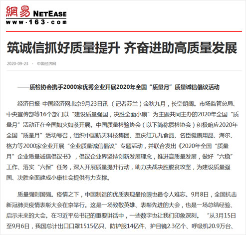 網(wǎng)易:筑誠信抓好質(zhì)量提升 齊奮進(jìn)助高質(zhì)量發(fā)展——質(zhì)檢協(xié)會(huì)攜手2000家優(yōu)秀企業(yè)開展2020年全國“質(zhì)量月”質(zhì)量誠信倡議活動(dòng)