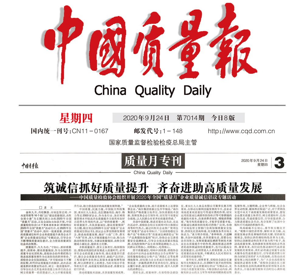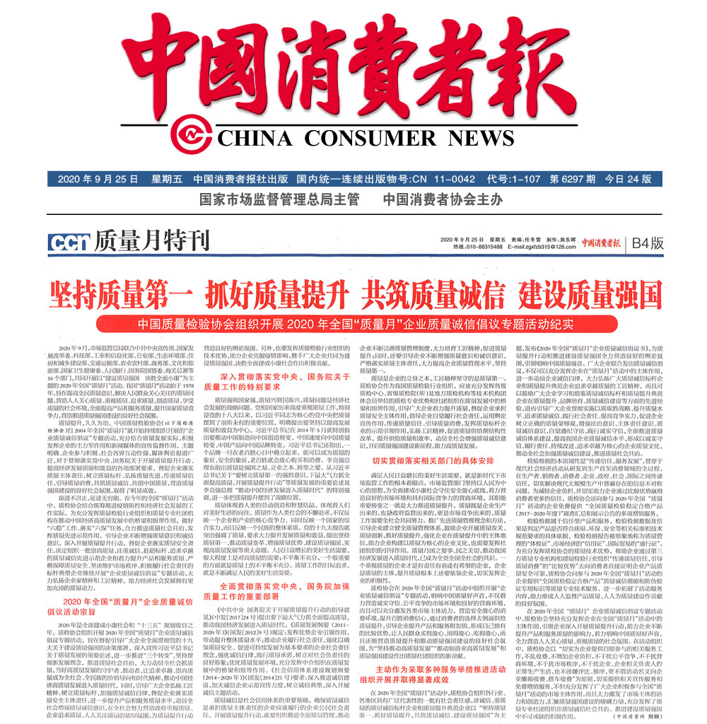 中國消費(fèi)者報(bào):堅(jiān)持質(zhì)量第一 抓好質(zhì)量提升 共筑質(zhì)量誠信 建設(shè)質(zhì)量強(qiáng)國——中國質(zhì)量檢驗(yàn)協(xié)會(huì)組織開展2020年全國“質(zhì)量月”企業(yè)質(zhì)量誠信倡議專題活動(dòng)紀(jì)實(shí)