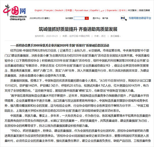 中國網(wǎng):筑誠信抓好質(zhì)量提升 齊奮進(jìn)助高質(zhì)量發(fā)展——質(zhì)檢協(xié)會(huì)攜手2000家優(yōu)秀企業(yè)開展2020年全國“質(zhì)量月”質(zhì)量誠信倡議活動(dòng)