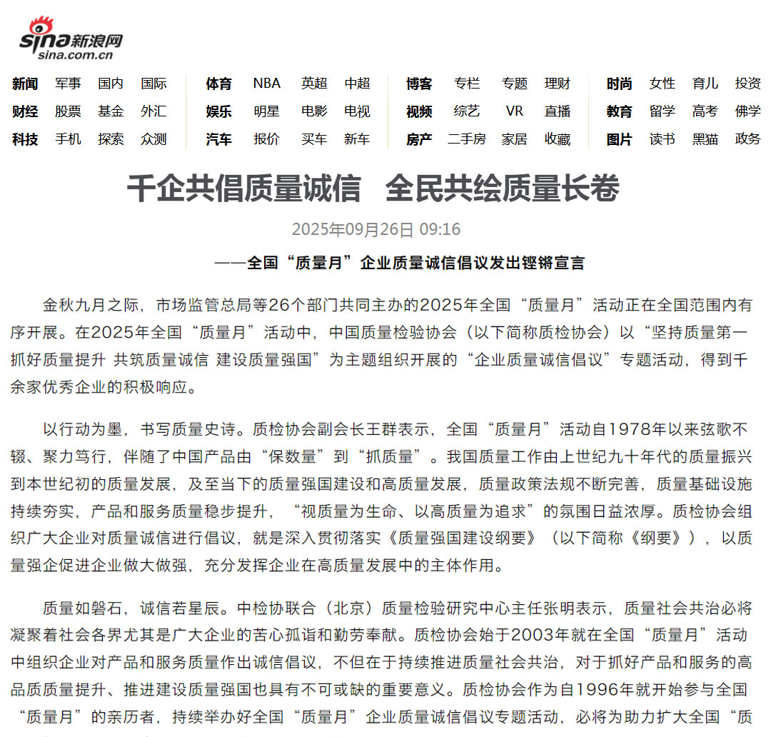 - 新浪網報道——千家企業(yè)發(fā)出倡議:視質量為生命 以高質量為追求——中國質量檢驗協會組織開展2025年全國“質量月”企業(yè)質量誠信倡議活動